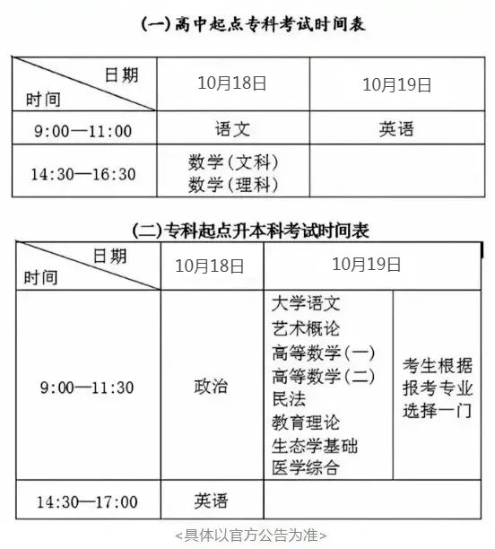 所有統(tǒng)考科目每科試題滿分均為150分。高起專統(tǒng)考科目每科考試時(shí)間為120分鐘,專升本每科考試時(shí)間為150分鐘。具體時(shí)間如下: