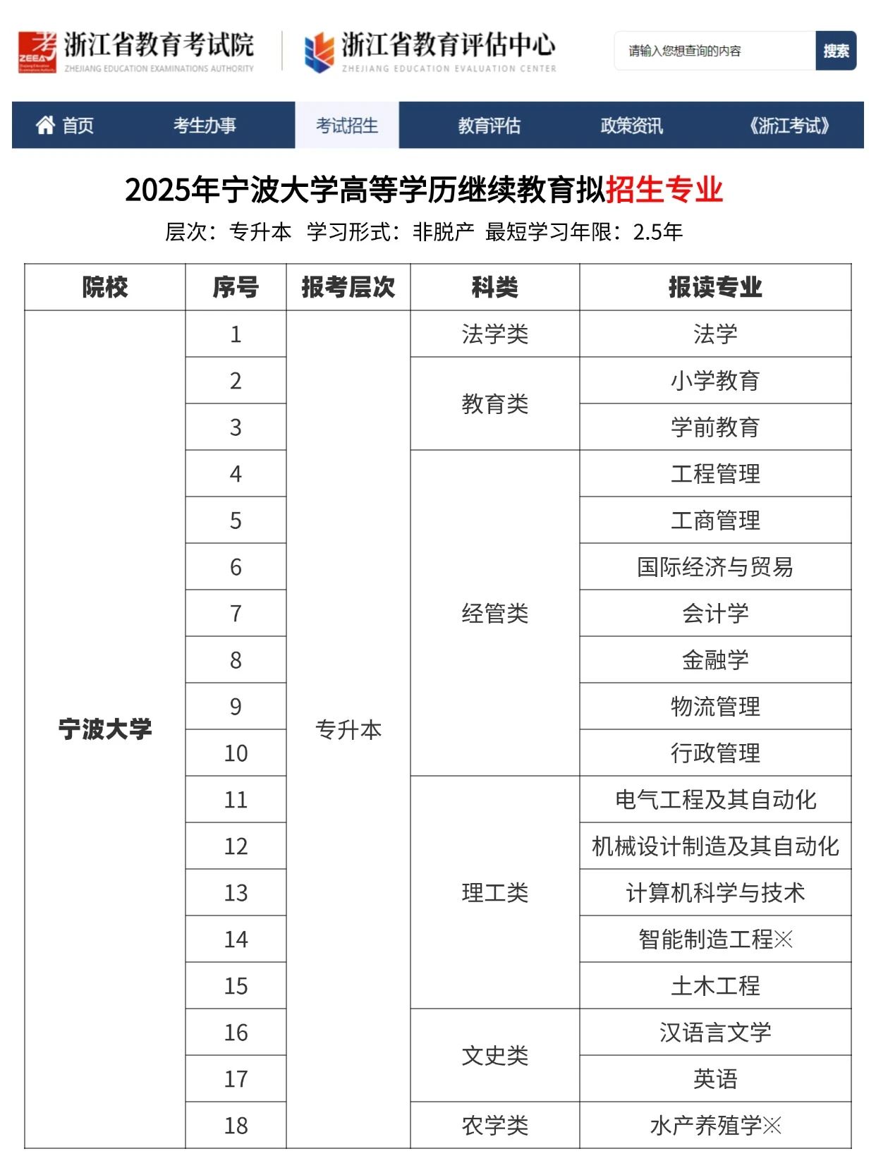 目前,寧波大學(xué)高等學(xué)歷繼續(xù)教育只招收專升本層次的學(xué)生。2025年擬招生專業(yè)見下表: