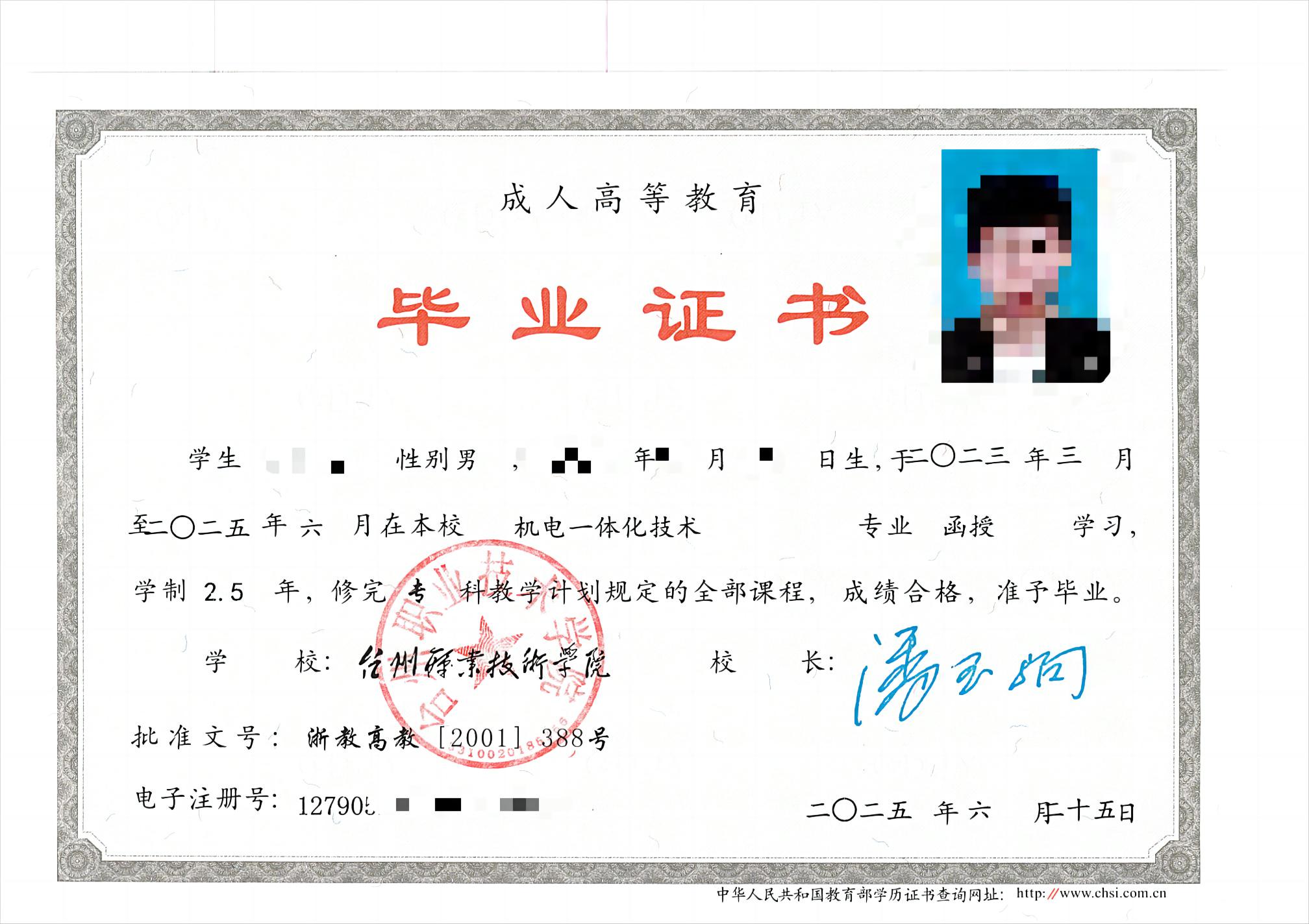 被我校錄取并注冊的學生,修滿教學計劃規(guī)定的學分,成績合格,符合畢業(yè)條件者,由臺州職業(yè)技術學院頒發(fā)成人高等教育畢業(yè)證書,教育部電子注冊。